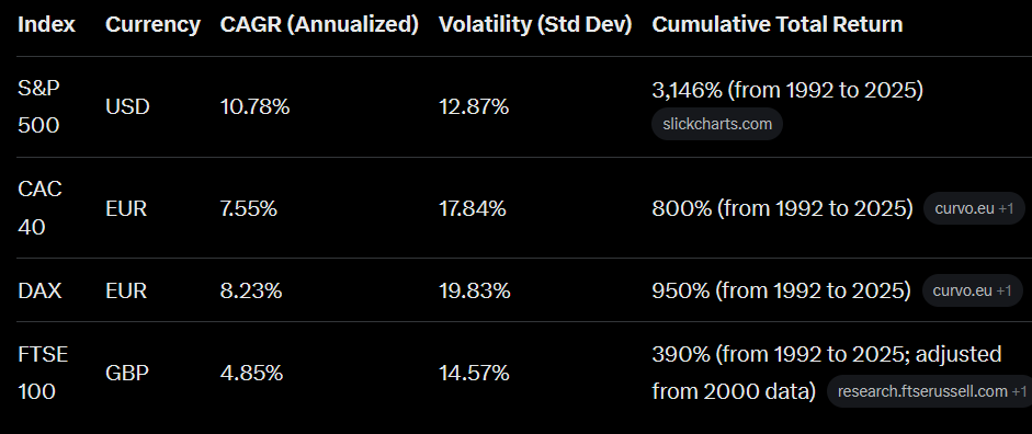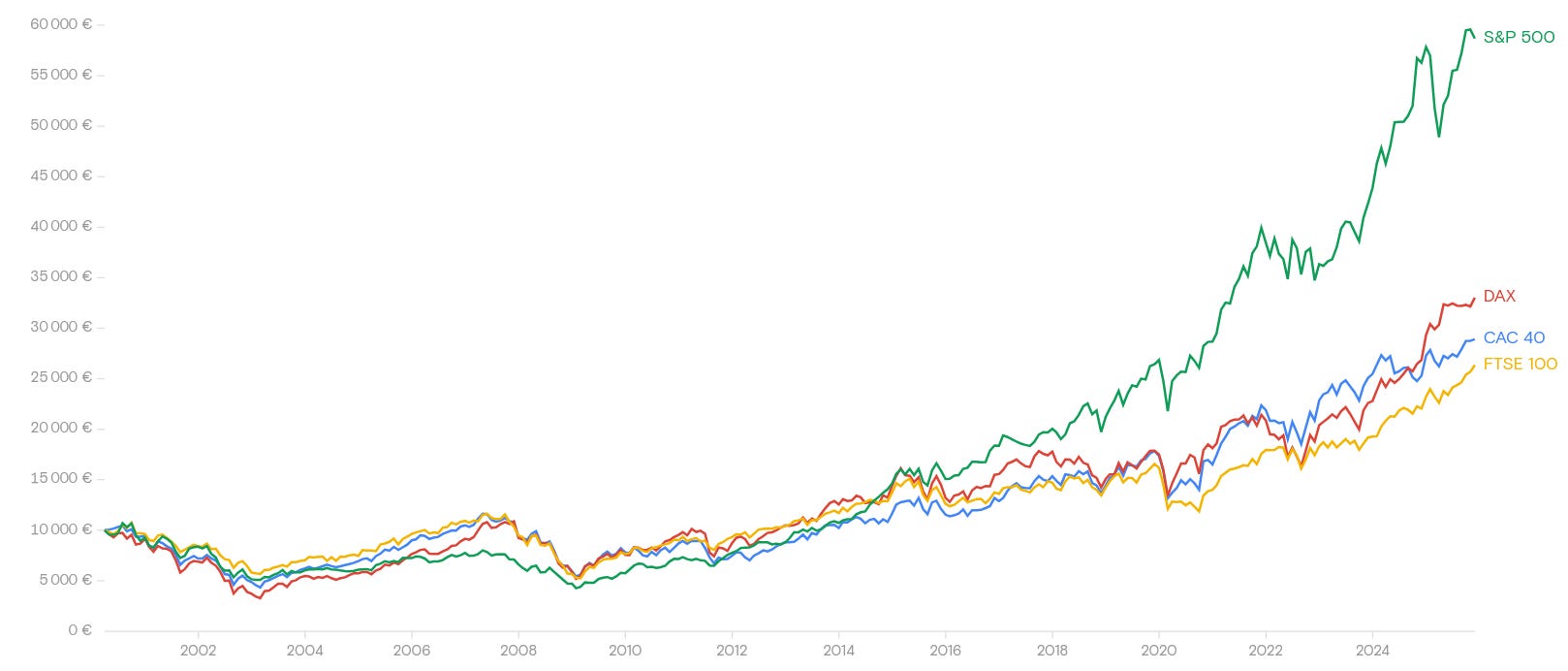 This observation is confirmed by results: the DAX’s volatility has been higher over the long term than that of the S&P 500, CAC 40, or FTSE 100. It’s a cyclical, volatile index that delivers very strong long-term performance (8.23% from 1992 to 2025). As the comparison shows, the DAX outperforms other major European indices in total return and has a standard deviation—the best metric for calculating volatility—of 19.83%, well above that of other major developed-country indices.