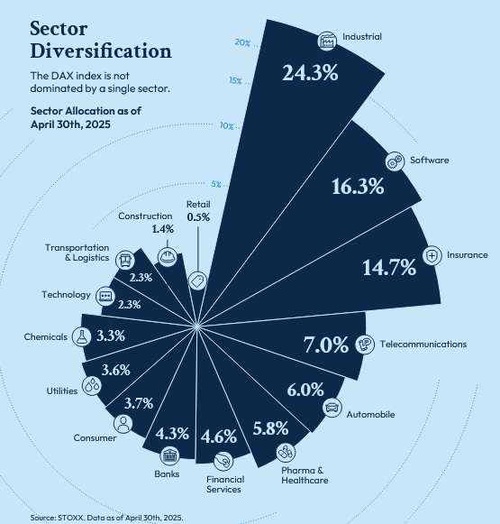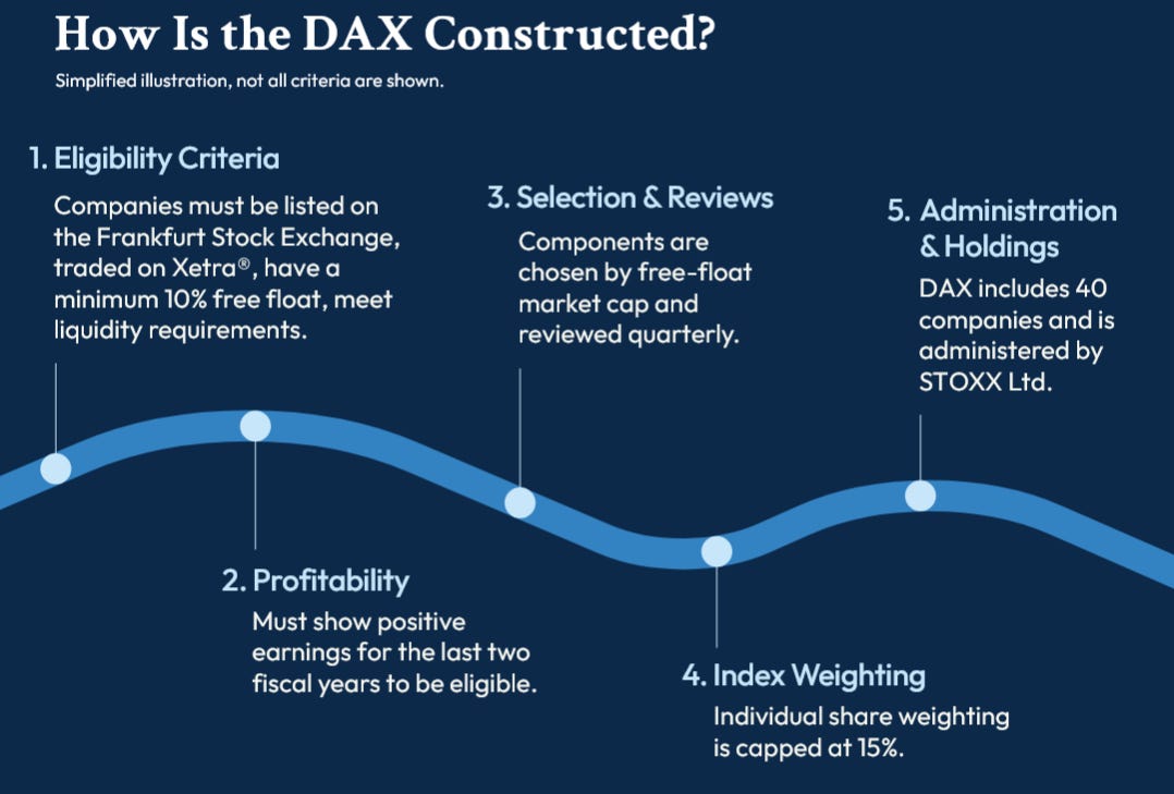Not quite. But let’s start with the basics: the DAX (Deutscher Aktienindex) is Germany’s flagship stock market index, representing the 40 largest companies listed on the Frankfurt Stock Exchange. It is managed by STOXX (a subsidiary of Deutsche Börse) and is often compared to France’s CAC 40 or the U.S. S&P 500. Adding a slight technical note: the DAX is a total return index (dividends are reinvested in the index). It is weighted by free-float-adjusted market capitalization, meaning company weights are based on the value of shares available on the market, excluding stakes held by founders or the state. A capping rule limits any single stock’s weight to 15% of the index.