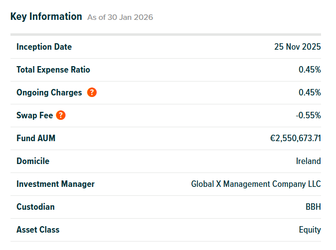 Moreover, the product is very recent. DYLD was created in November 2025 (official launch on November 25, 2025 on Deutsche Börse Xetra) and its assets under management are very limited. As of end-January 2026 (latest data around January 30), the fund’s AUM stands at about 2.5 to 3 million euros according to sources. It’s tiny for a UCITS ETF, especially compared to European covered call giants (e.g., the Global X QYLD suite totals several hundred million, and the UCITS covered call market exceeds 4-5 billion globally).