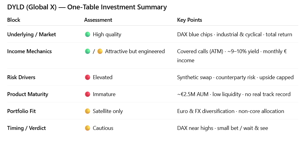 In short, I’m dipping a small toe into DYLD, Global X’s new DAX Covered Call ETF (9.7% forward yield in euros). It’s one of Europe’s rare high-income plays on German blue-chips, perfect for euro diversification away from dollar-heavy portfolios. But it’s tiny (€2.55M AUM), synthetic (counterparty risk), and brand new (launched Nov 2025)—pure early-adopter speculation. Worth watching if European covered calls take off?