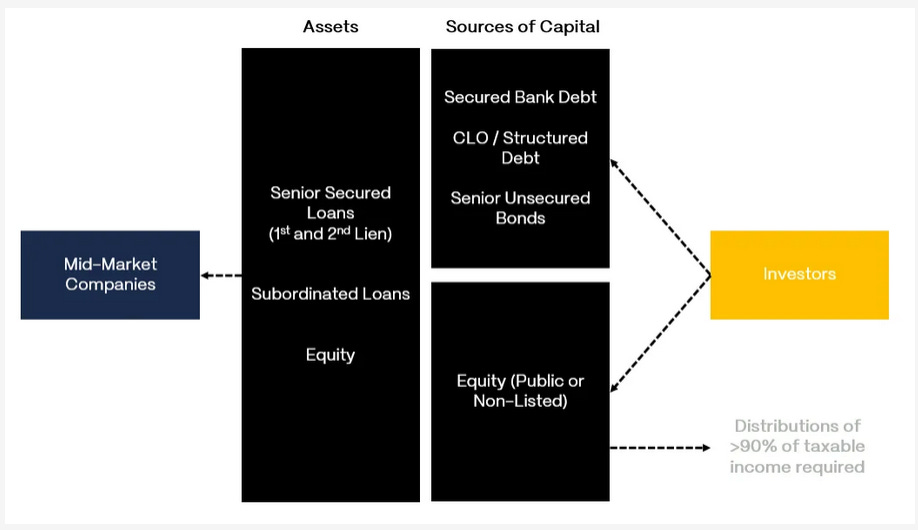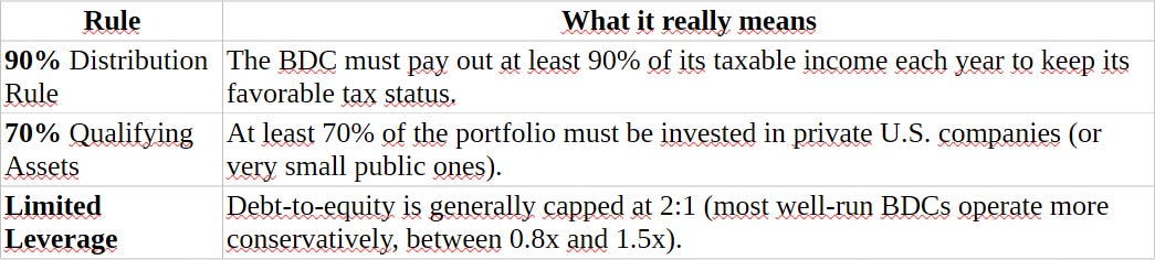 There’s also an important soft rule: BDCs don’t just lend money – they must provide significant managerial assistance to the companies they finance (strategic advice, board seats, operational support). It’s lending with a hands-on approach.