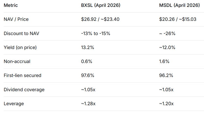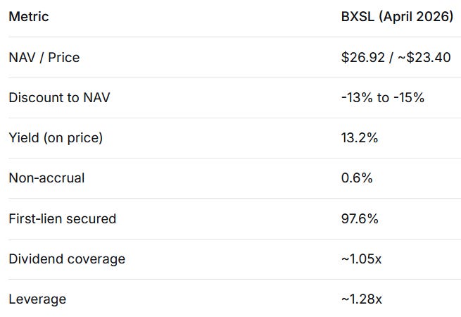 Compared to peers like ARCC (~5% discount), MSDL (~8% discount, higher non‑accrual), or MAIN (premium), BXSL offers a rare combination of quality and a double‑digit discount.